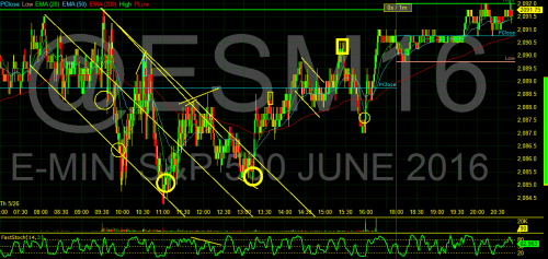 Today there were only 3 5 Minute signals on the RAMBOT 2 Buy Signals and 1 Sell if you refer to your es chart or mine below the thiker outlined circles and squesr represent the 5 Min RAMBOT signal and the thinner ones are the 1 Min signals you can see the results as plain as day