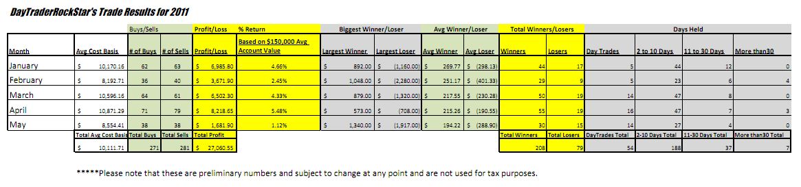 My realized gains from Jan 2011 through May 2011 are currently $27,057. If I close out most of my positions this week I would take an estimated loss of $11,000-$13,000. I would not sell anything in IRA's at this point as I firmly believe markets will make new highs later this year. But this scenario hasn't played out yet.