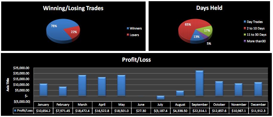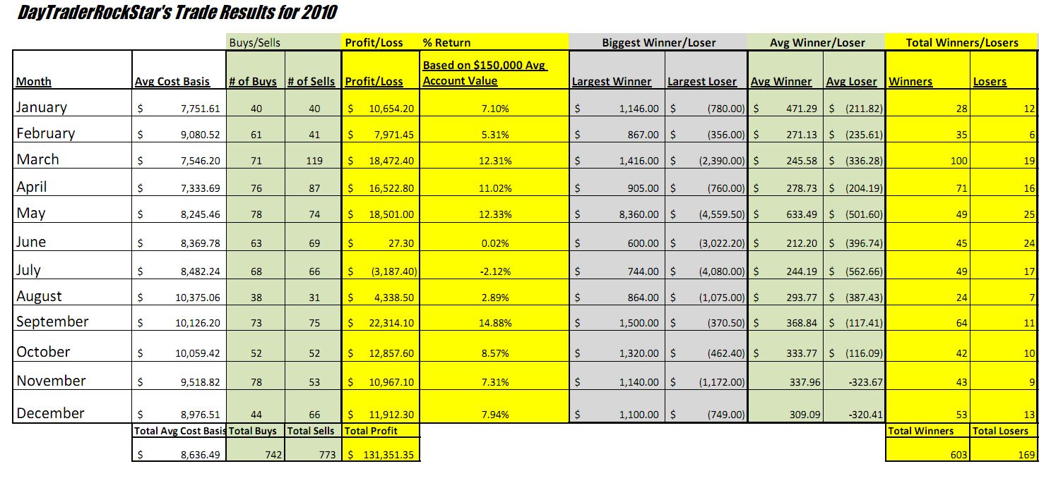 The following chart below breaks down my 2010 monthly performance. May was inspiring because I was able to feel some of the uneasiness in the market and liquidated most of my positions before the Flash Crash. I know a lot of members remember that day and followed suit and are probably around today because of it. But that turned out to be one of the best opportunities in the market. So you can see the major pull backs in 2010 were profitable. But as a trader in the spotlight you're only as good as your last trade. And the markets are filled with unexpected pitfalls (political, environmental, and economical). We are seeing them all this year.