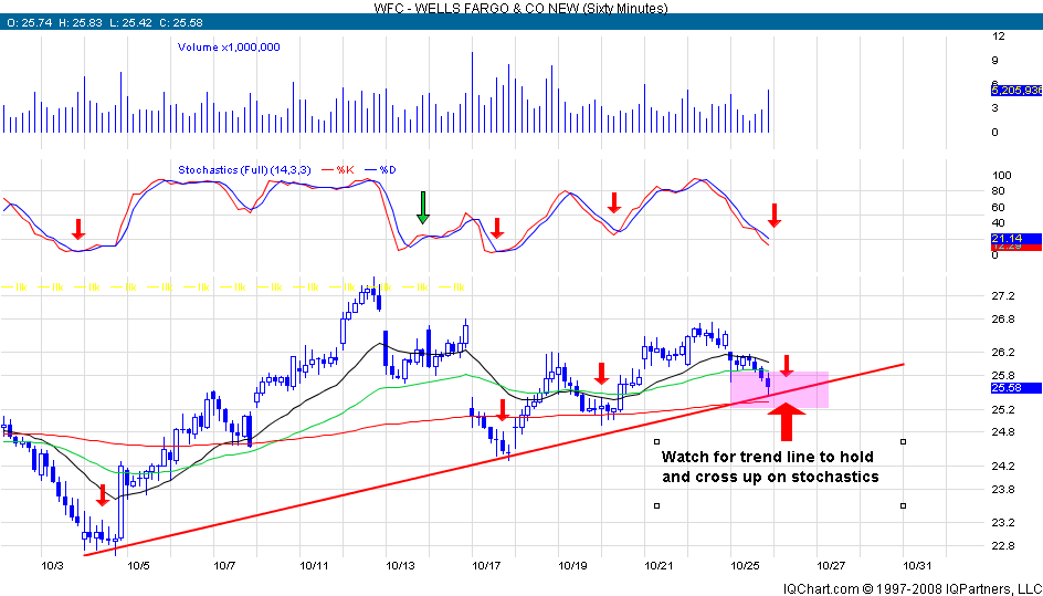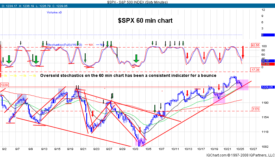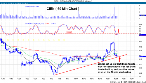 Tomorrow the 60 min stochastics will get oversold again. This has happened 7 times over the 2 months and produced a tradeable bounce in the markets. Combined with this is an underlining trendline that goes back to the beginning of the month. This combination is one of my favorite combined indicators and makes up the core of a high probability set up. I posted some charts that are also setting up and should benefit from this set up.
