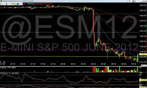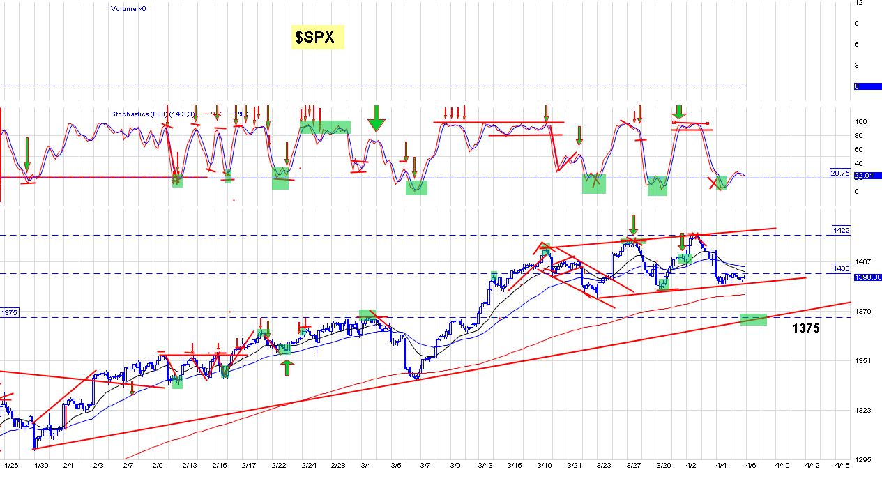 First Take a look at the futures close on Friday Below you see the Non-farm payrolls for March disappointed the markets and took them down 15 points. Because this was on basically a closed market day and no real liquidity in the markets I expect this to be a great opportunity if you have your trading plan set up for Monday. Definitely want to split the week into 2 parts. Monday Gap down on the $SPX (S&P 500) I want to be ready to buy into 1375 area +/- 5 points There is a very nice trend line on the 60 min I will be showing during the show. The Trend line starts Jan 30th and runs through March 7th and comes right under the 1373-1375 zone.