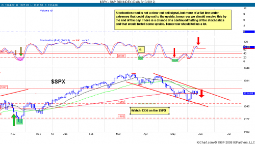 Video outlines 7 short ideas and a few longs, but going into the weekend and Greek elections trading will be choppy. Technicals point to further weakness as pointed out in video and the 1336 level could be seen as a positive breakout in the markets on the shorter term. The next 2 weeks I feel will be very pivotal in the overall medium term direction of the markets. Bearish sentiment is strong and that is one big positive for the markets. Seems like we been hearing the same story for the last 3 months..But the next 2 weeks are very important and there are 2 questions that need to be answered. Is the markets pricing in a lot of this potential negativity ie. Greek exit, and will there be a coordinated effort on the parts of the "global central banks" to cut off any further deterioration in the EU. Not expecting a solution, but a coordinated response.