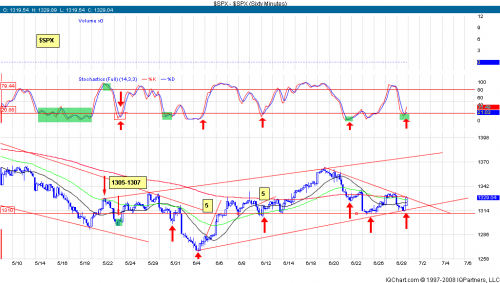 Like an on off switch the markets rotated back down from it's recent overbought level (see charts) down into a short term oversold level and left really no doubt on the charts that we entered a bullish bias for tomorrow. This should be an easy read even if we have a failure and cross back over on the 60 min stochastics. I will be watching the first hour to see if can hold onto a piece of the 10 point run we had at the end of the day on Thursday. Not without saying...News will always be the wild card in the charts. 60 min is bullish and daily building what looks like a bear flag. Levels to watch on the $SPX 1338 and 1308.