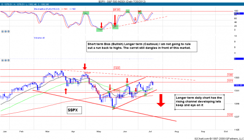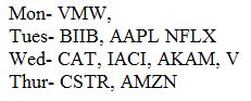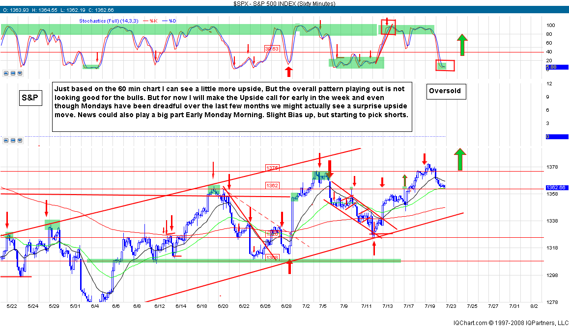 This week's watch list is epic! The Return of $YHOO and 2 other "Kick Ass Trades of the Week" I also added a great under $10.00 set up and discussed trading ideas in $PBR, $DE and a short in $TZOO. Oh yeah this week's watch list has a great short too. Last week bias was up for the first part of the week and down at the end- Mostly based of the 60 min chart. On Friday we again got oversold on the 60 min chart. But we have some longer term overbought indicators starting to flash red along with a very bearish pattern on the daily. We have a good selection of earning out next week