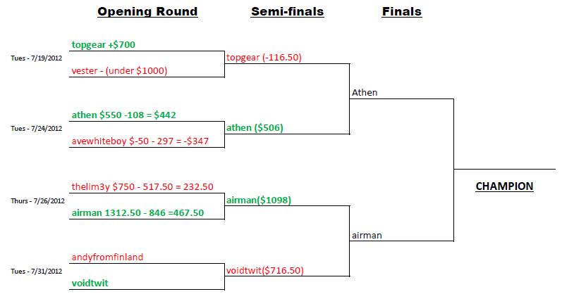In two matches, Athen has racked up a total of $948 and Airman has a grand total of $1,565.50 (after commissions). These two have proven that they have what it takes to be the Ultimate Trader. We will see on Thursday at 3pm who comes out on top!