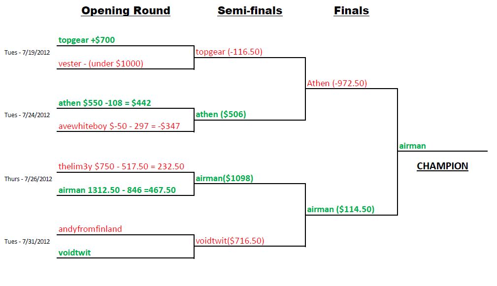 Airman will now go up against DayTraderRockStar with the opportunity to win DTRS's money. The match will be scheduled sometime in the next two weeks. If airman beats DTRS, he will take home half of the profits that he made during the match.