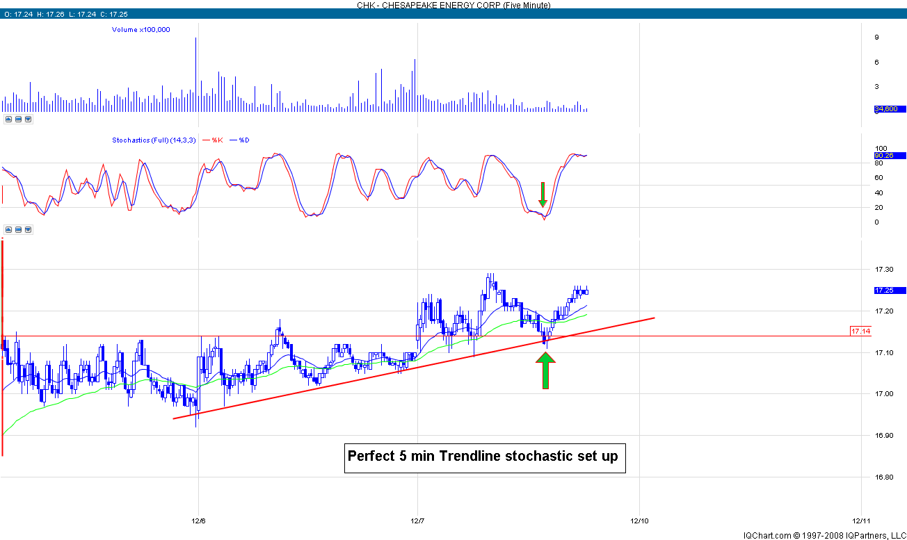 Here was another great 5 minute set up called the lower trend line channel stochastic bounce, a pattern that works great on the daily, 60 min and 5 min chart. But really great for scalping on the 5 Min