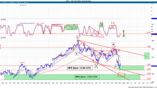 As next week rolls around and if there is no new shockers out of China or Europe. I suspect the charts get back in rhythm, And if you look at this chart uner here you will see that the chart really didn't fall out of rhythm. But another 1-2-3 pattern had formed since we put in the recent top (4) around 1554 that combined with 1 and 3. So that channel is 1-3-4-5.