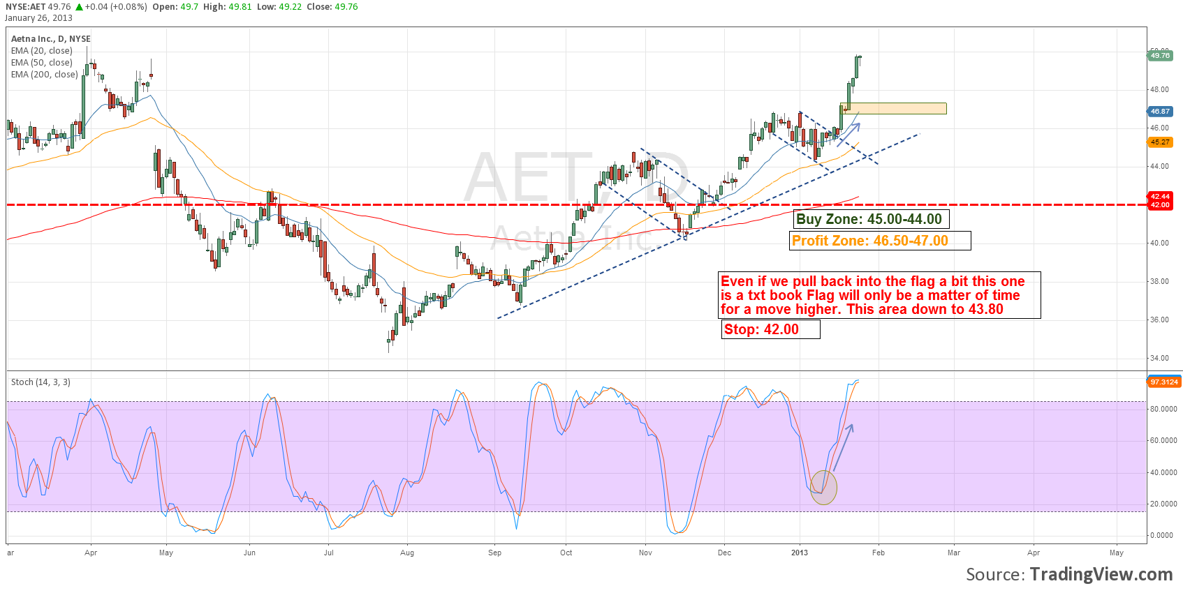 A flag is a continuation pattern where we see the stock or trading vehicle consolidate usually in a sideways to downward angle. This comes after previous move higher that has a steeper trajectory. The Flag give the stock time to rest and because the recent larger move up buyers are holding back on buying at those levels.