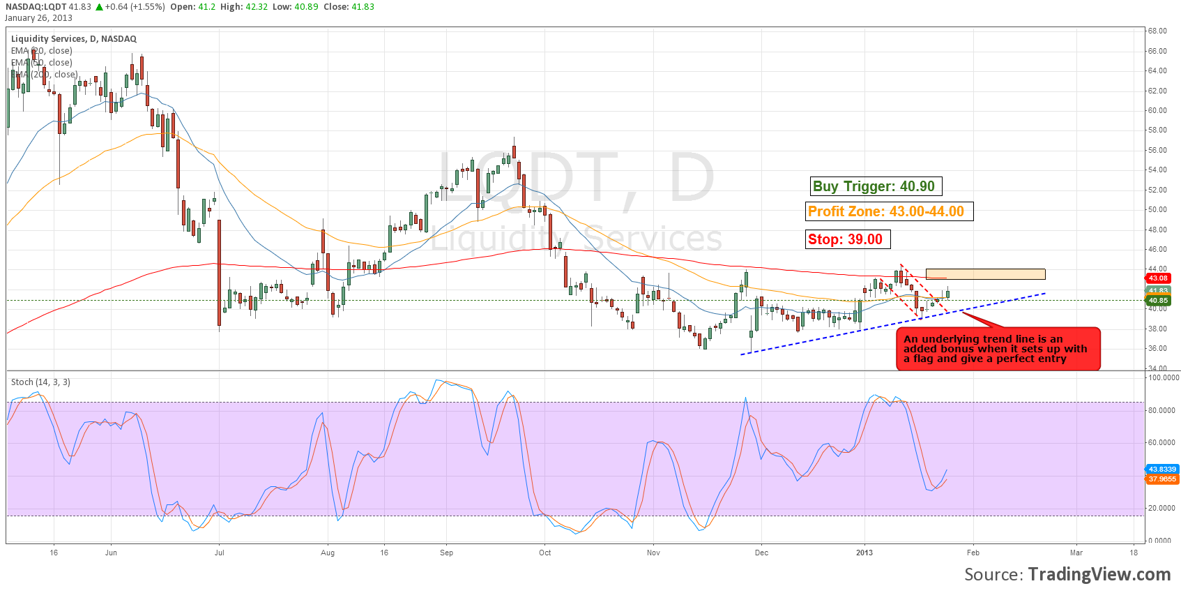 In the HPS Methodology the Flag is considered 1 indicator that has other indicators added to it. It is always important to have some other indicators lining up along with this recognizable pattern. Stochastics and Lower Trend Line support will add a lot to timing your entry.