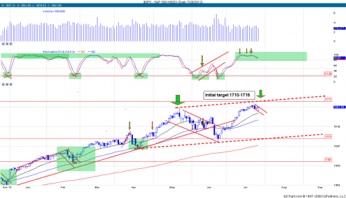 Below you will see a nice target I have on the next move up in the S&P 500. It only seems right to continue to respect the recent trend lines and a break of the 1700 zone will satisfy the criteria of a new high being taken out to set us up for a pull back into the channel.