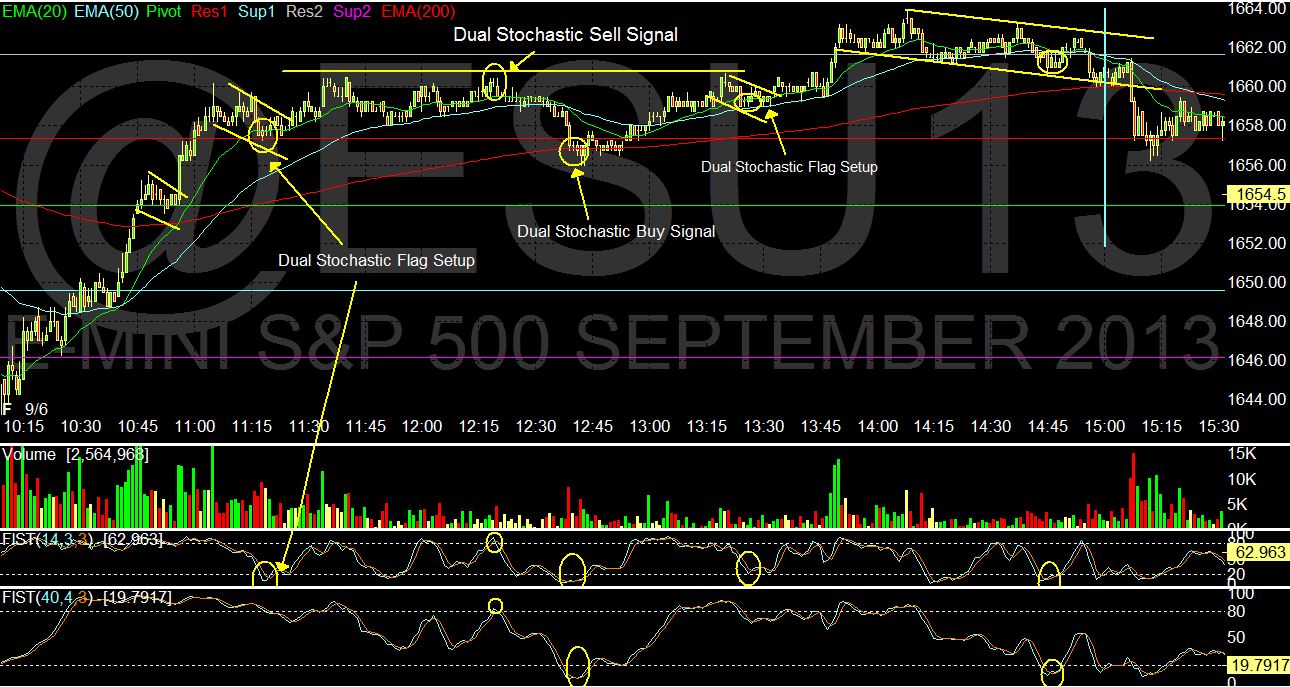 Wow what a fun Friday, Really shows how current events can effect the market. The es futures had (2) 20 point moves then a 10 point move as we sold off into the close. You don't get to see this everyday! Every trading day as I broadcast live on DayTradingRadio I point out certain levels and zones on the es chart these I call HPZ (High Probability Zones) and they are based on a dual stochastic method I developed over the years. Taking into consideration 2 periods, a long and short look back. A 40 period and a 14 period. I refer to these two as a fast signal (14) and a slow signal (40) you can see the difference on how fast then rotate from overbought to oversold. Over a long and continuous period of studying these 2 signals I started to notice a synergy between them, Which produced a signal better together then there individual effects. Now alone this is a great stand alone indicator but when combined with some other indicators the percentage of success only goes up. When you watch DTR you see in real time how these indicator work and its never after the fact. The fact is it works and works even better when combined with certain zones. These could be areas based off of channels and trend lines, previous support and resistance, Fibonacci's or many of the other popular indicators. How do you know which one to use? Well personal preference I guess to start of with. For me the true signal comes with the combination or the dual stochastics on the 1min time frames combined with the 5 min time frame and the 14,4,3 stochastics. I always discuss this on the show so if you want more explanation please ask.
