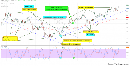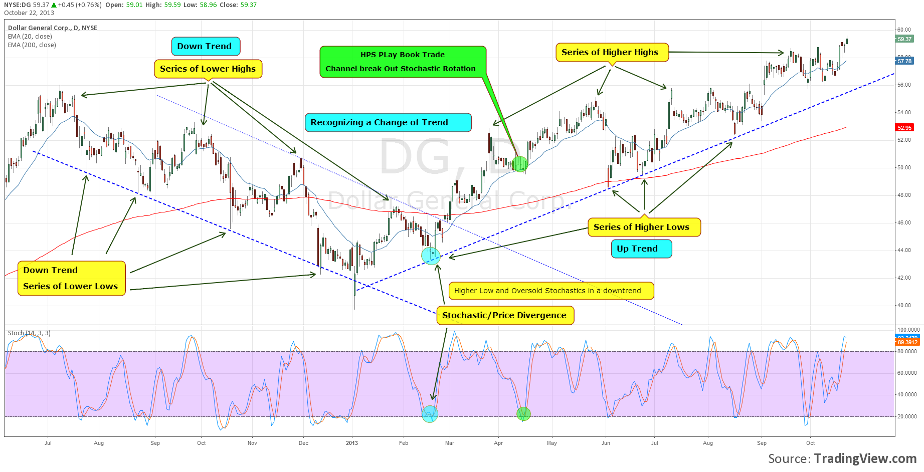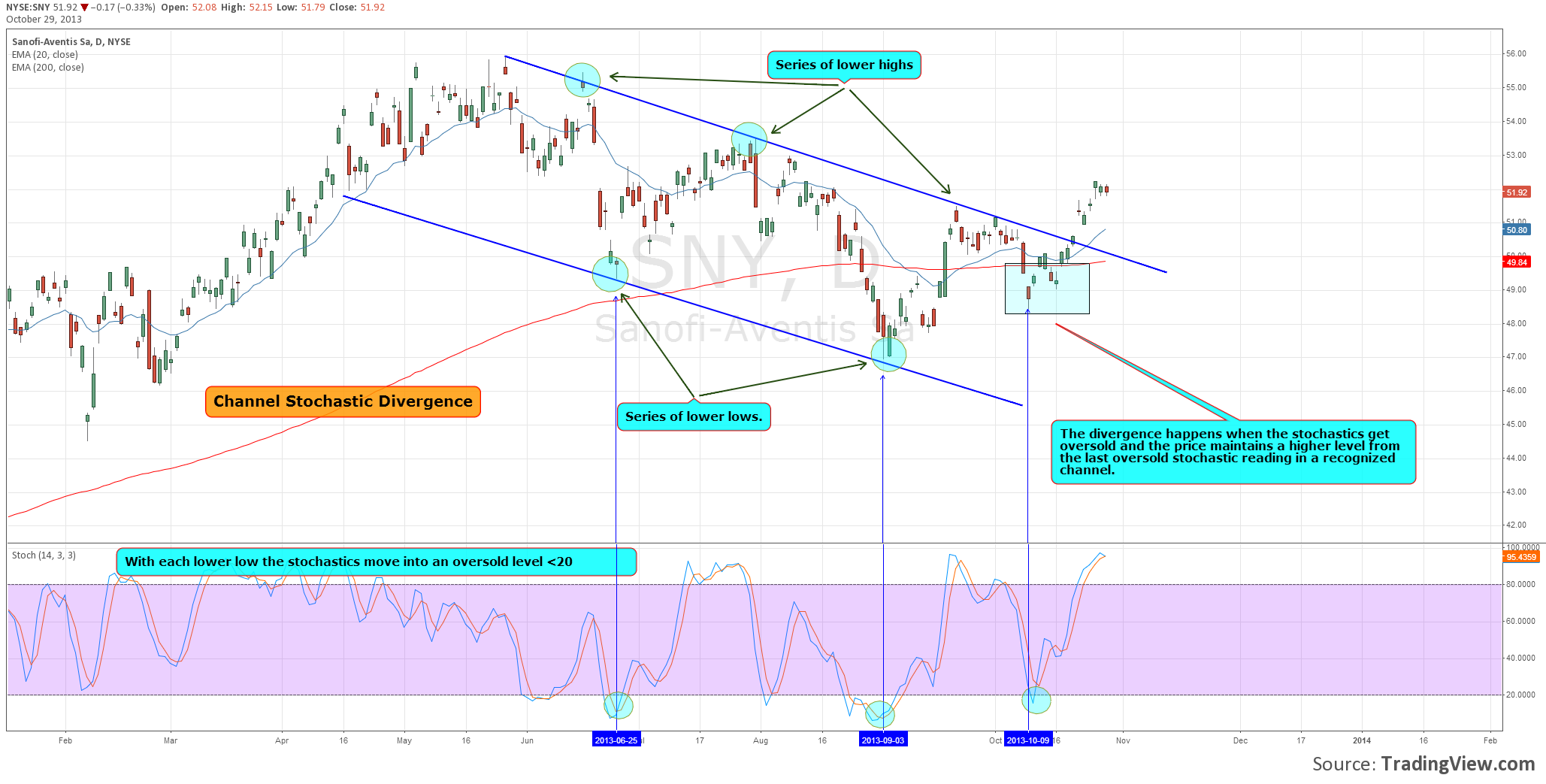 Stochastic Price Divergence this divergence is a another great technique in determining a change of trend. What is key here is to see the recognized confirmed trend in the stock or index this technique works great when we are in a confirmed channel. As the price in in our example makes lower lows you should see the stochastics cycle alone with the price and get oversold as the price makes lower lows. The divergence happens when the stochastics get back down into a oversold level as it had been doing in the downtrend, but the price puts in a higher low. This can usually be seen clearly in a organized channel and usually is the first signal that a break out of the channel is approaching.