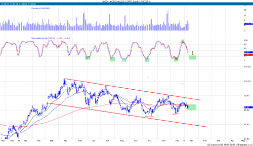 Now on to a little education.... MCD (McDonalds) Has a great channel that it has been trading in for the last year. The stochastic signal could have been traded on each signal with a great return. I am starting to see a Stochastic-Price Channel Divergence in the chart that is represented by the recent oversold stochastic oscillator and the higher low on the price. We are about to get oversold again in MCD and will be watching for a move back up this week.
