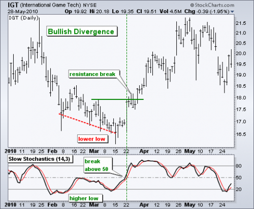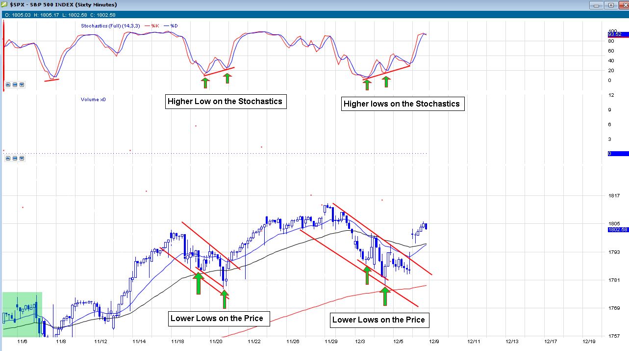 Because stochastics can get embedded ( meaning pinned in an extreme level usually above 80-90 or below 20-10) They are susceptible to false readings. When you add the 4 other indicators to the equation you lower that risk a lot, but it is still there. The key with the stochastics is looking for a pure divergence when the stochastics make a higher low but the stock price makes a lower low. This show the momentum slowing and shifting like a rocket that is peaking so after the price follows suit. Here are some examples and the last one will be the example that happened this week and predicted the move higher today. (Some might say it was the jobs report) The fact is the divergence was there and it is not a common thing so when you find it you better watch it.