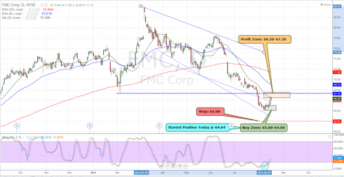 FMC we had great patience waiting for this to set up properly. Stochastics at the time of the entry where oversold on both 60 min and daily time frame and it came down into our HPS trend line zone. The breakdown of the bigger channel happened due to market volatility during some geo-political events. The notes posted mentioned a fast profit to be had and it did not disappoint. I am still holding (I expect a move back up to top range of profit zone. The alert was sent when profit zone was hit on Friday.