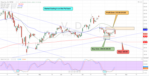 V (Visa) Well Hope you took profits on the alert. Worked out fine but it happened fast. Still in this myself I feel V is a great stock for a swing, but the truth is I was no where near internet connection when the alert hit. Still Holding...