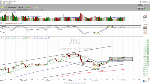 (JNJ) Just a rockstar type of chart and company.Breaking out of a consolidation and looks great for continued upside with a nice stop under 102.50. But i don't even seeing a pull back back into the consolidation.