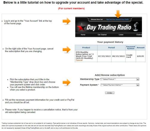 Members that are paying lower monthly fees can just cancel there current sub and choose the Lifetime package and be done with it. But if you have been a member for more then 1 year and in good standing I will extend a additional discount of $100.00 in form of a coupon code. This is the best I can do considering the extreme discount given for this special. Please email Paul or myself and we can set this up for you. http://daytradingradio.com/pages/contact and click on support ticket