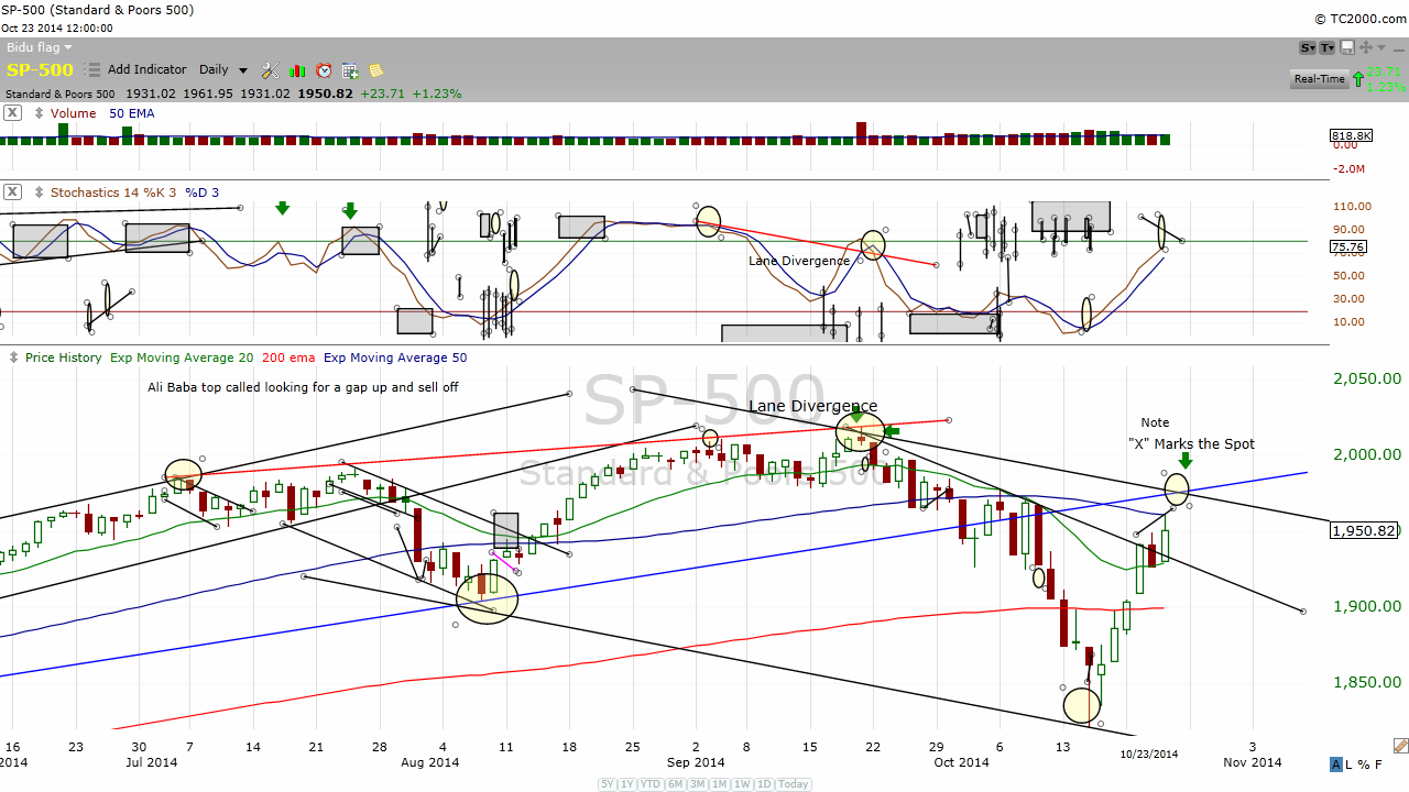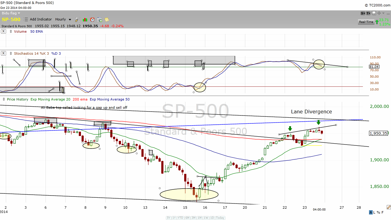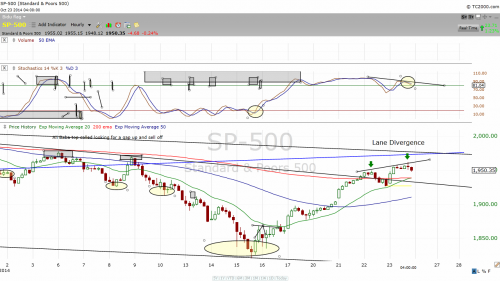So now that that's out of the way.. Tomorrow's market has a 60 minute Lane Divergence actually appearing. This is a pretty decent signal but we know the market has been as a bull and it has given us great profits this week. It is time to take a more cautious look at more upside. We have a "X" Marks the spot trade zone right above us around 1972-1975 This is doable and if we "do" get there expect me to take on a more short or bearish outlook. Next week we have another Fed meeting 28th-29th. Markets are sure to get jumpy mid week.