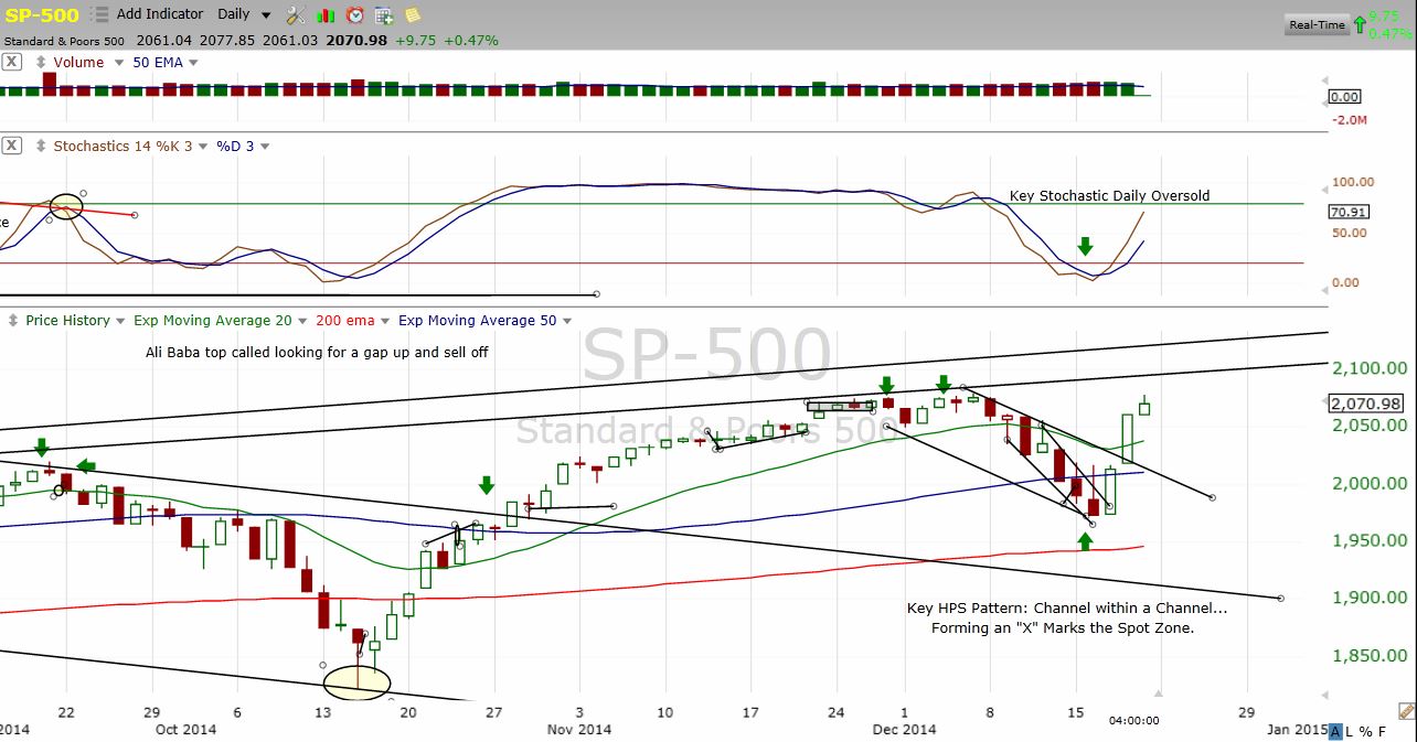 "Well we went out on the lows, But I definitely want to go on the record and say this will be seen as a great opportunity going into the week of Christmas. The pullback could be considered a Christmas present but timing will mean everything. I am expecting the main move to come closer to Christmas and the early part of next week could still be volatile and weak. The chart below shows last years pullback before Christmas and also shows the type of candle that really pointed to a extended rally. In each of the pull back the reversals came on a big reversal candle.I will be looking for this.also. Last Year the week before Christmas