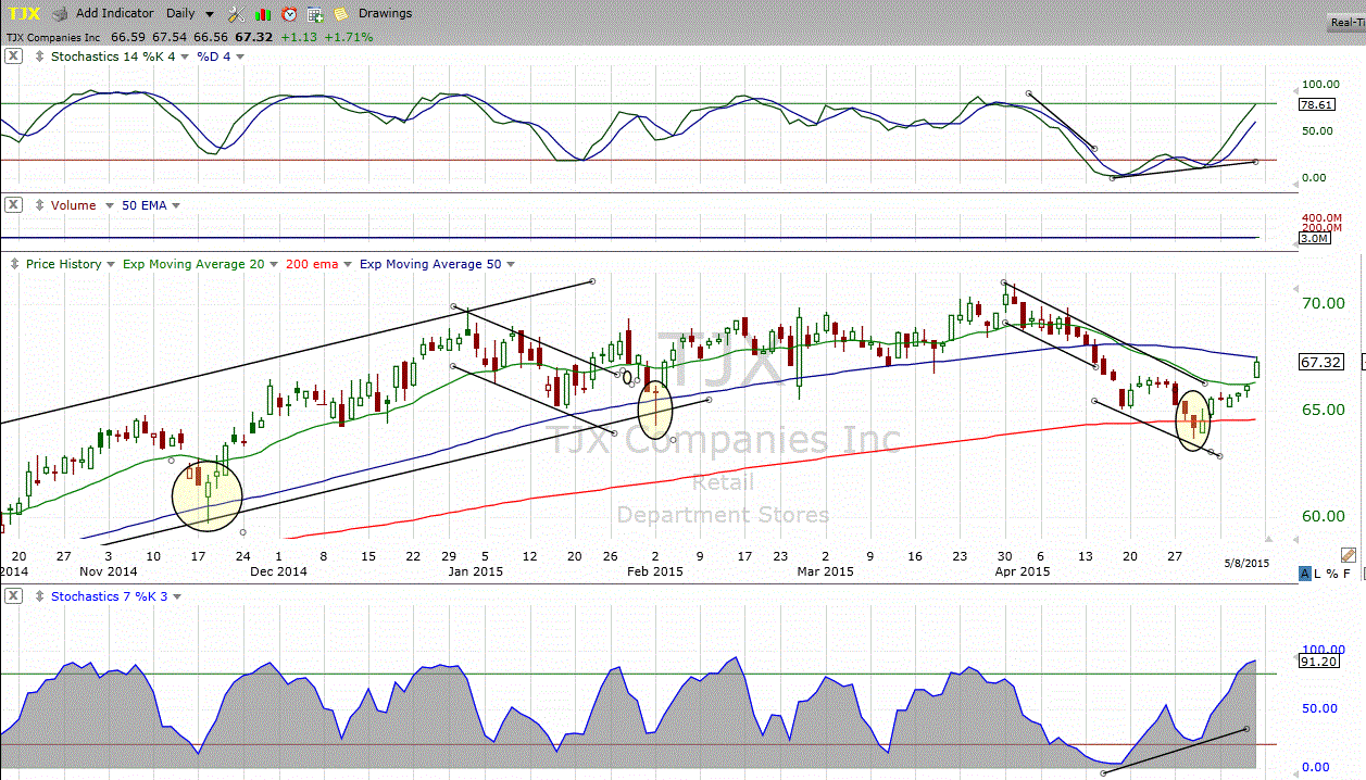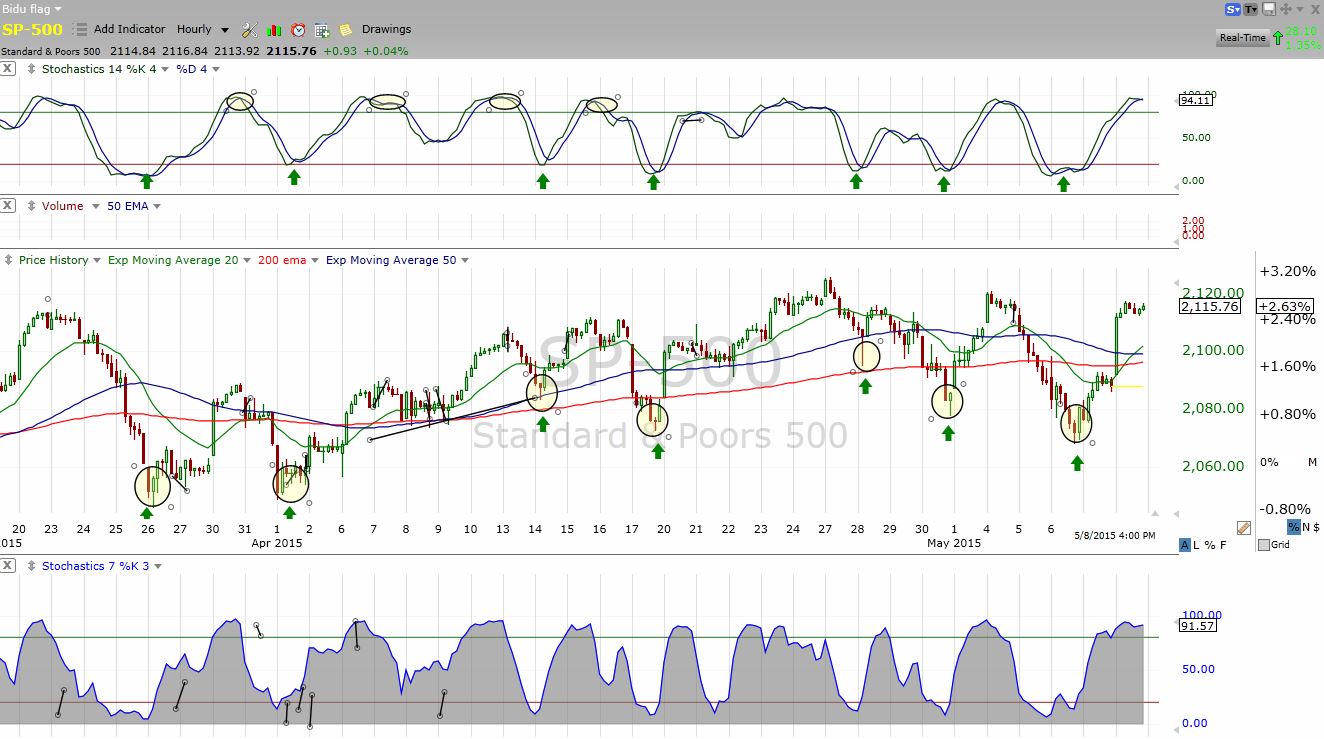 Now if we look back at the chart you will see that 60 min time frame is again overbought. The question here is do we again rotate back down or if you look closer you can see the stochastic lines start to embed up against the 90 area. This is usually a bullish indicator and We could see higher levels.