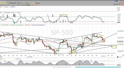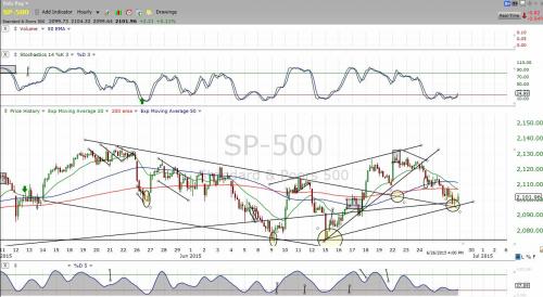 "60 minute time frame is oversold and this has been a great timing tool but Greece overhangs everything. The charts have set up in a nice rising wedge pattern out of the larger channel breakout. The pullback today was expected but the energy seem a bit intense. Levels below on spx 2098-2095 look very nice. But not calling a perfect touch as the 60 min and 5 min are setting up for another move higher.. So recap.. Daily embedded and 60 ready, but many stocks over extended. Feel Greece will be a factor in the next move but not guessing how that will play out."