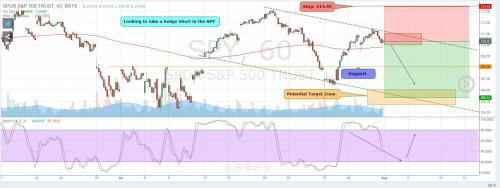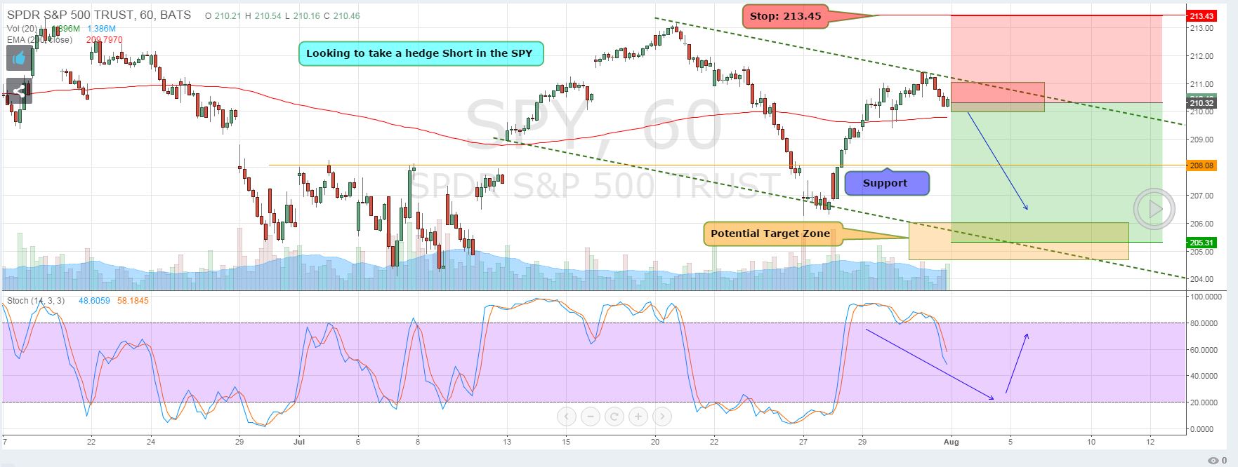 We have a 2 Arrow downside Radar for early in the week, Meaning a set up with at least two indicators lining up with a sell signal. These signals need to be weighted with current market sentiment. The market Radar Video also goes over in detail the current channel that has set up. Also I want to take another short term hedge for the early part of the week. This is shown in the chart below