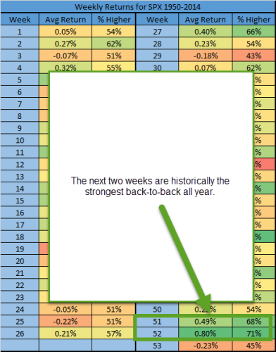 Christmas week and the week leading up to it has always been a tough week for me historically. So much that every year my wife reminds me to not trade in December. It seems to put stress on the whole family and myself with everything that come with December. The chart below show that December is one of the most volatile months of the year and even though we saw how volatile it can be over the last week we need to recognize that the last 2 weeks of the month are the strongest 2 weeks of the year.