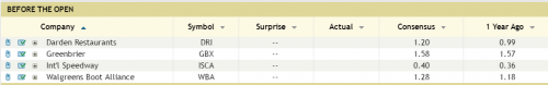 First significant earnings are Tuesday morning with DRI (Would be Long)