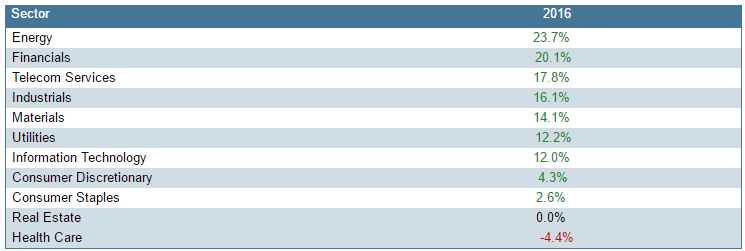 The post-election rally was powered by the financial sector, which took off on a pro-growth trade that featured a steepening yield curve, and cyclical sectors that would be in a prime position to benefit from faster growth and rising inflation.