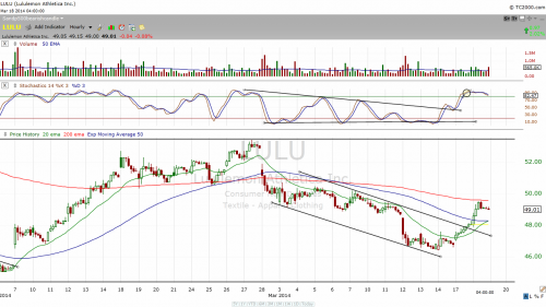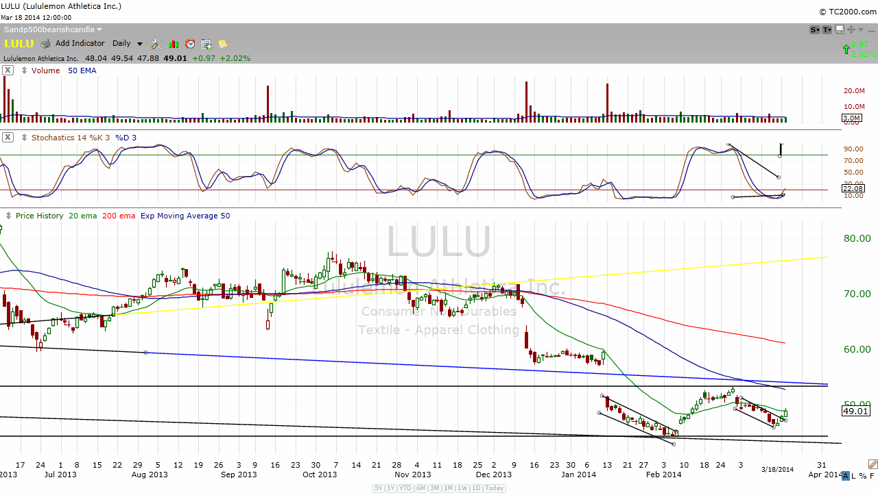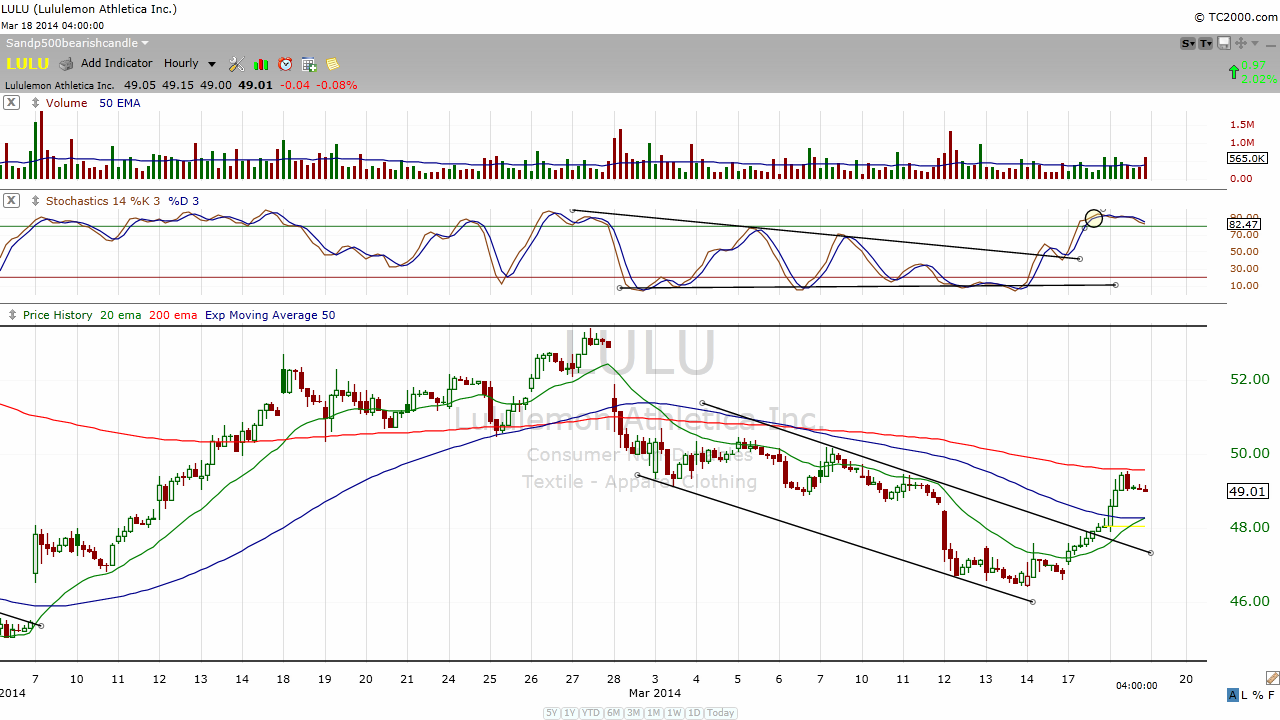One of this Week's Best Bet was $LULU I want to show you 2 charts that show how to time a channel entry the Entry on LULU was seeing the 60 min stochastic coiled up as we were already oversold on the daily. The 60 min time frame really tightened up as the price touched the lower channel line that was part of a 1-2-3 pattern.
