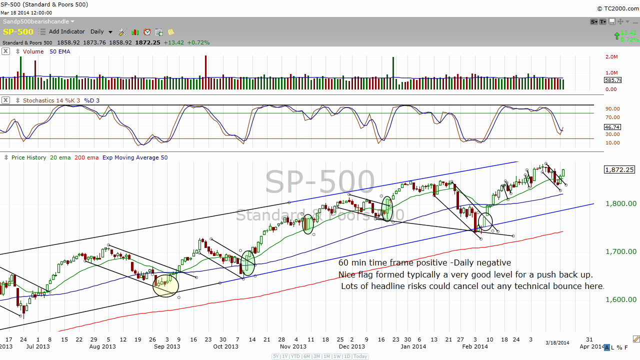 A fast note on some great setups for mid-week. Charts are showing up very clear, Markets have digested the current Russian news and looks to be eye-balling new highs. Before getting to excited we have a FOMC Rate decision and more taper talk scheduled for 2:00 pm tomorrow. Last appearance from Chair Janet Yellen was received very bullishly by the markets. I can't see much different this time around. As long as the issues are out in the open this market seems to fear nothing. Expect the unexpected to stop this market in it's tracks. Good luck on figuring out when that will happen. Until then business as usual lets continue to profit and be disciplined.