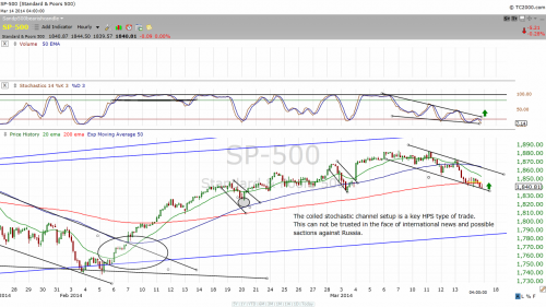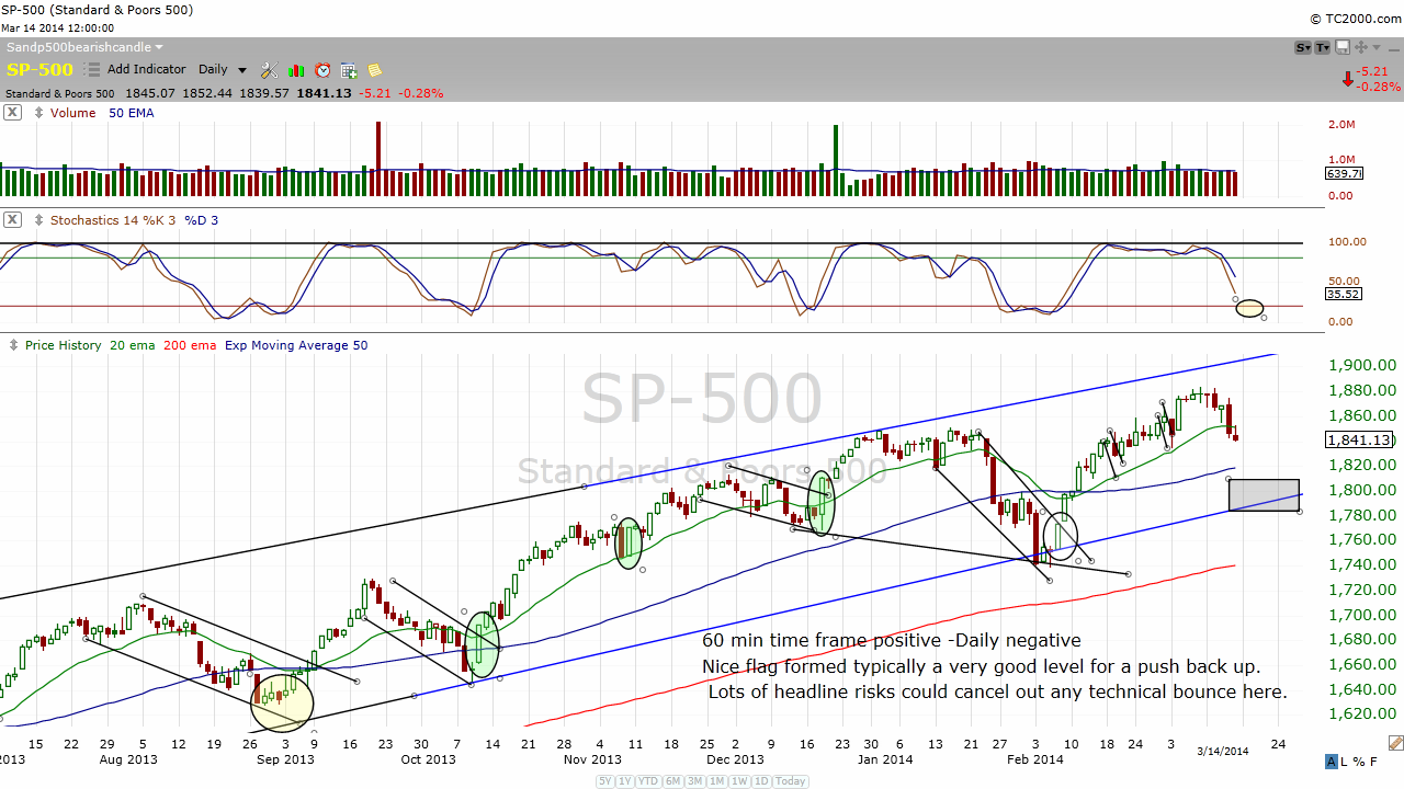 What happens in the Ukraine this Sunday should have an effect on the overall markets come Monday morning. The "citizens" of the Crimea region will be voting to secede from Ukraine setting the stage for the peninsula to return under Russian control. The Ukraine, U.S and the European Union contend the referendum is illegal. How will this play out in the markets? The markets technically could get damaged here as the daily chart continues to show more weakness ahead, but the shorter time frame (60 min) is bullish. This all goes out the window though because events like this trumps technical's and trend lines.